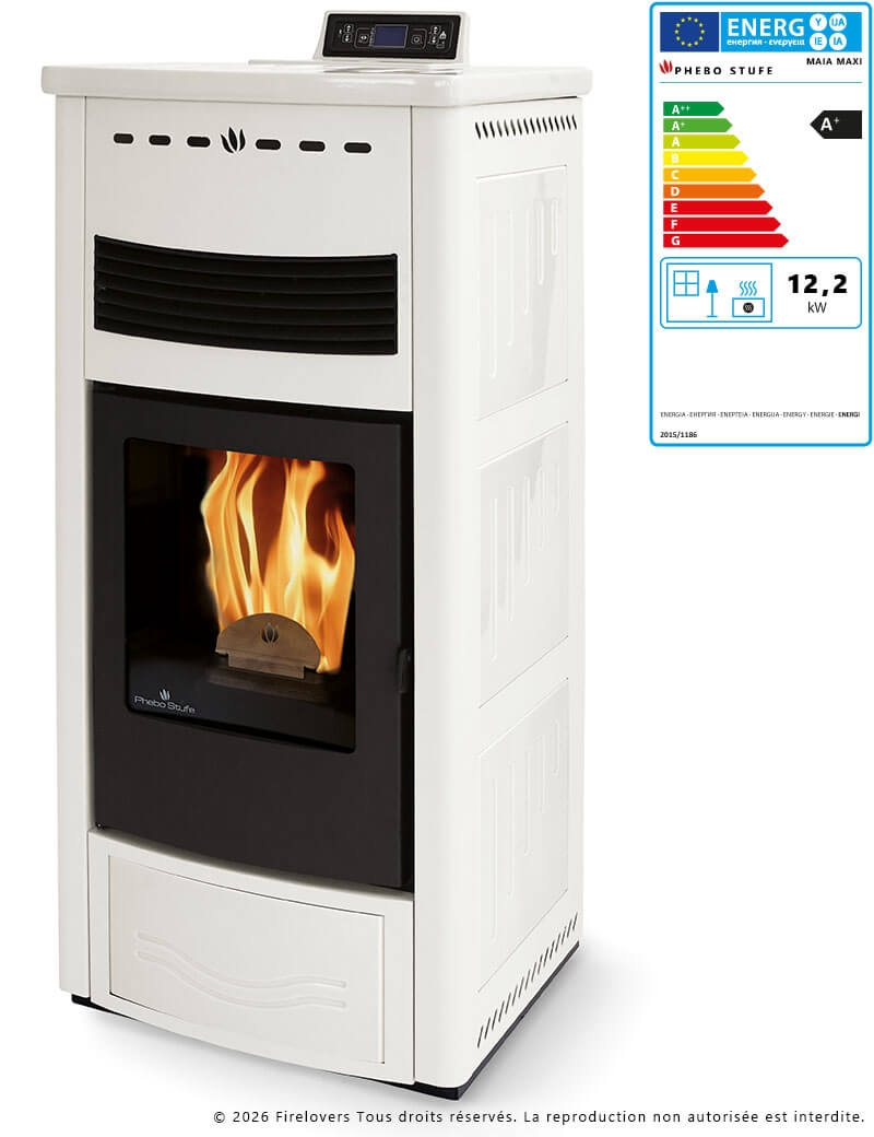 Maïa Maxi est un poêle à granulés ventilé signé Phebo Stufe, conçu pour chauffer jusqu’à 350 m³ avec une puissance de 4,99 à 12,20 kW et un...